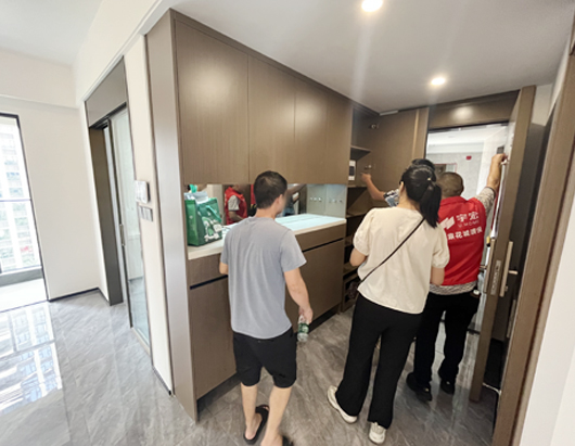 本次交付還組織了上百人的快修隊伍在樓下隨時待命。業主在驗房過程中發現小問題,陪驗員立刻在樓棟快修群里,上傳問題,呼叫快修人員??煨奕藛T帶著工具,5分鐘內即可到達業主房內,馬上幫業主修復??焖俜磻焖俳鉀Q問題,受到業主們的廣泛好評。